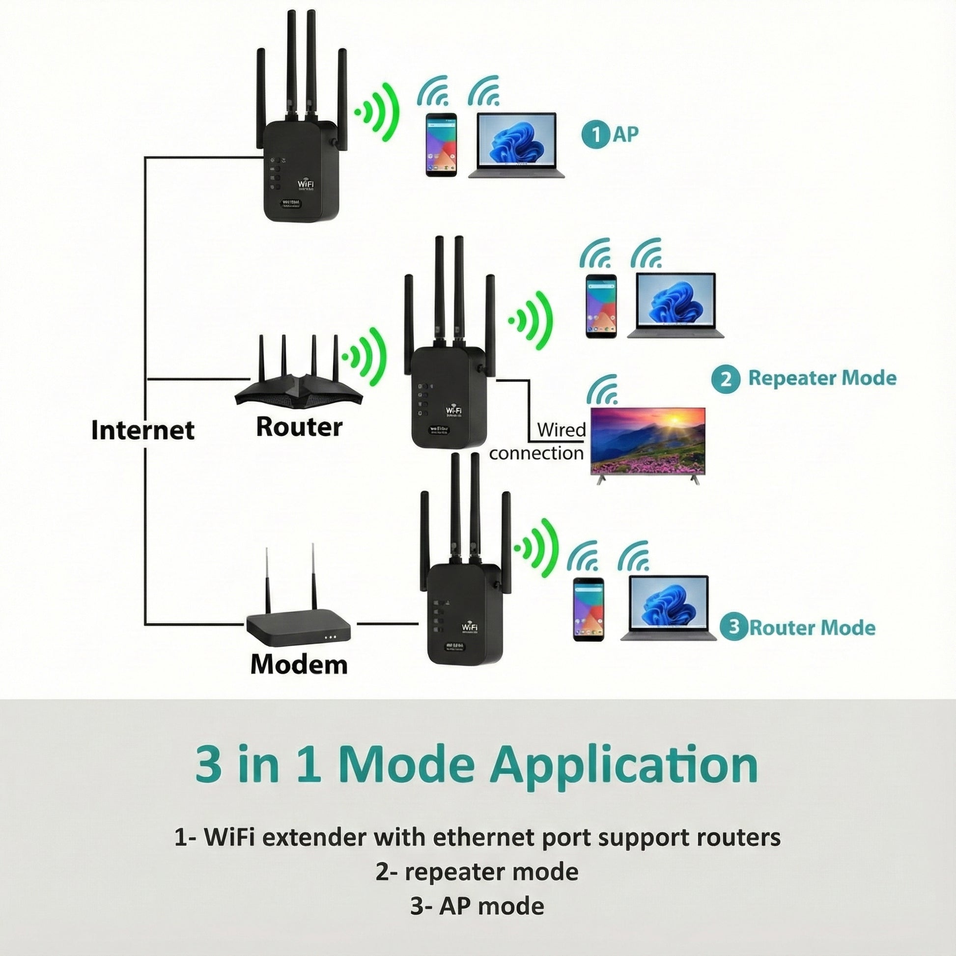 • Repeater Mode: Amplifies and extends your existing router signal to eliminate weak zones.